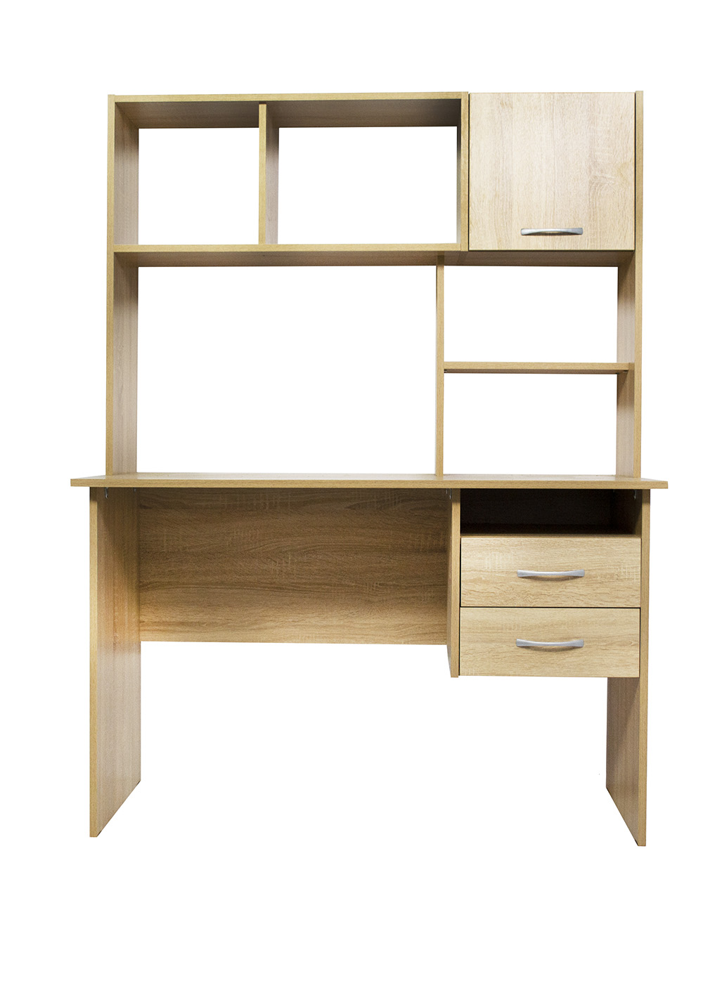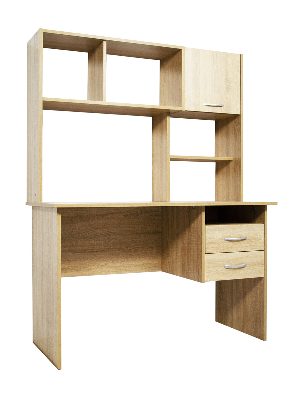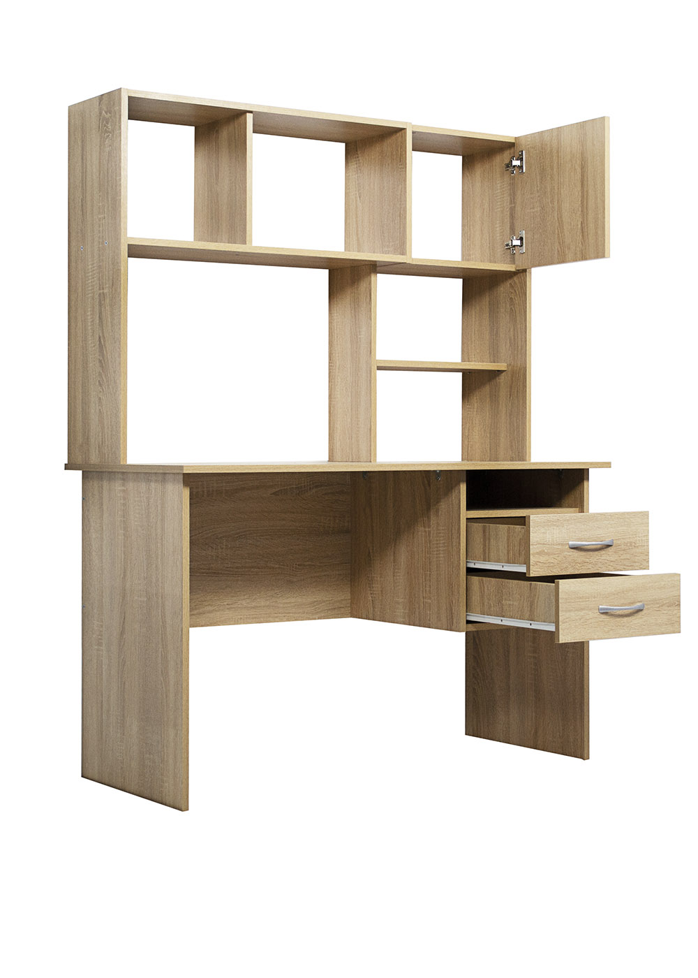 Стол имеет просторную столешницу, два выдвижных ящика и надстройку с открытыми отделениями и закрытым шкафчиком. Отличный вариант для комнаты студента или ученика.