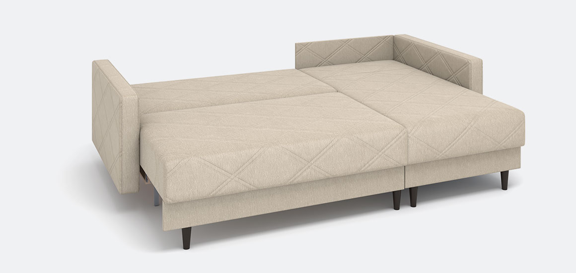 • Высокие опоры из пластика (клиренс 12 см): Диван легко парит над полом, упрощая уборку и обеспечивая доступ для робота-пылесоса.