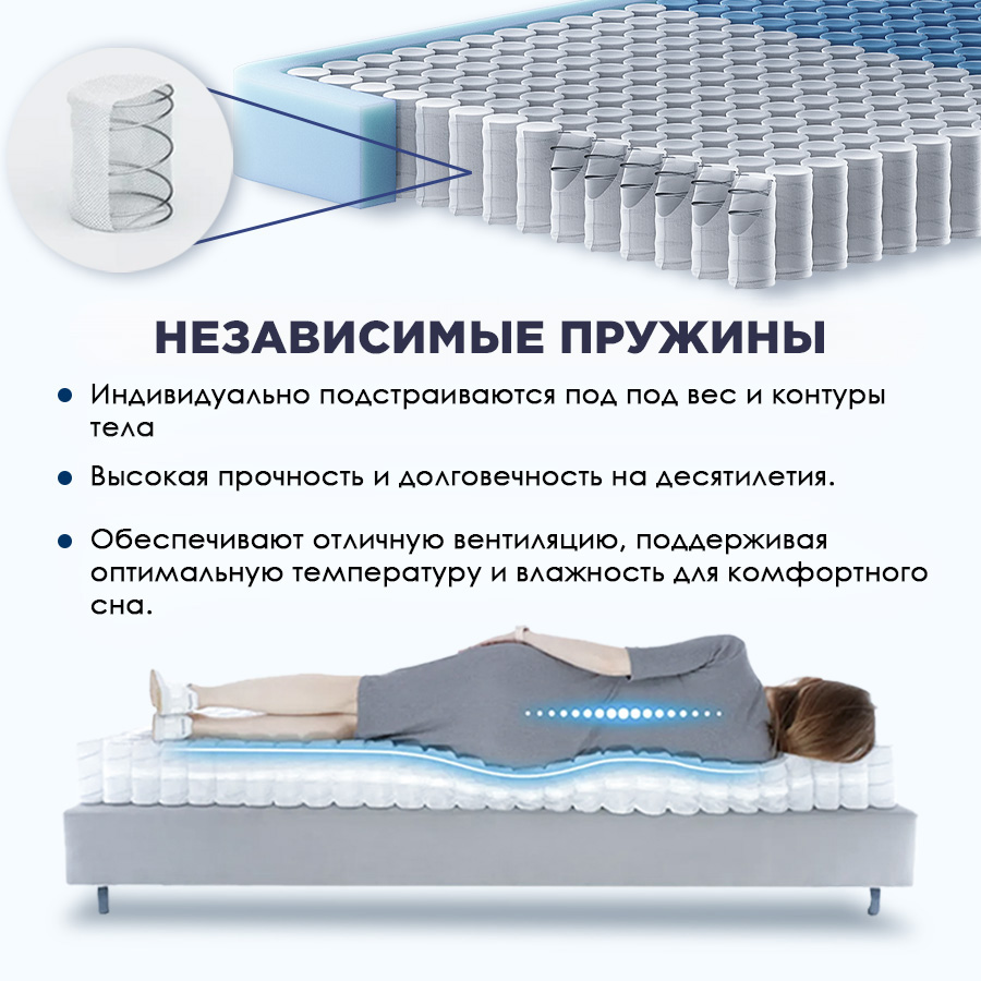 ✓ Ортопедический эффект: Независимый пружинный блок гарантирует правильное положение позвоночника и отсутствие дискомфорта при движении.